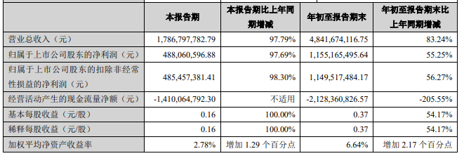 同一日披露三季报的还有长城证券。今年前三季度,公司实现营业收入48.42亿元,同比增长83.24%;实现归属于上市公司股东的净利润11.55亿元,同比增长55.25%;第三季度公司实现营业收入17.87亿元,同比增长97.79%;实现归属于上市公司股东的净利润4.88亿元,同比增长97.69%。