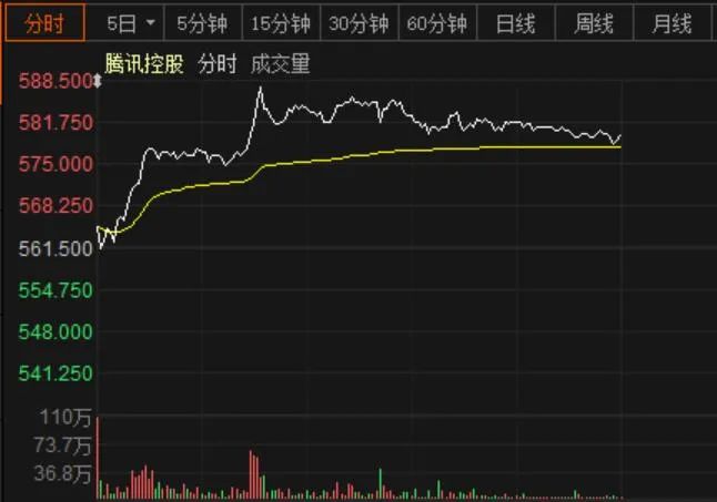 10月27日,腾讯控股早盘涨幅一度逼近5%,股价最高攀至588.5港元再创历史新高,最新市值达55687亿港元,半日市值最高增幅达2587亿港元。