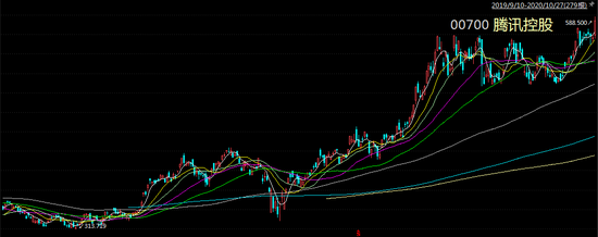 受蚂蚁集团上市的刺激,10月27日,腾讯控股早盘涨幅一度逼近5%,股价最高攀至588.5港元再创历史新高,最新市值达5.58万亿港元。