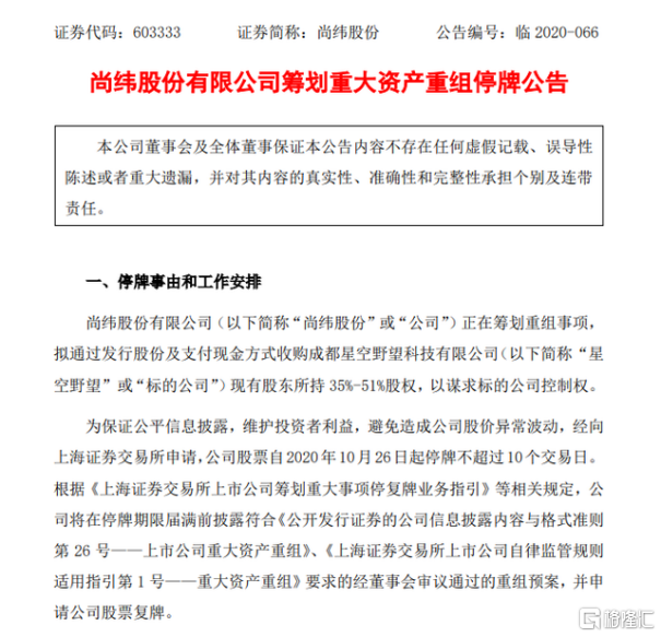 10月26日晚间,尚纬股份发布公告称,公司筹划重组事项,拟收购成都星空野望科技有限公司(以下简称“星空野望”)现有股东所持35%-51%股权,以谋求标的公司的控制权。本次交易亦可能涉及交易对方以协议转让等方式受让部分上市公司老股,但不涉及上市公司控制权变更。