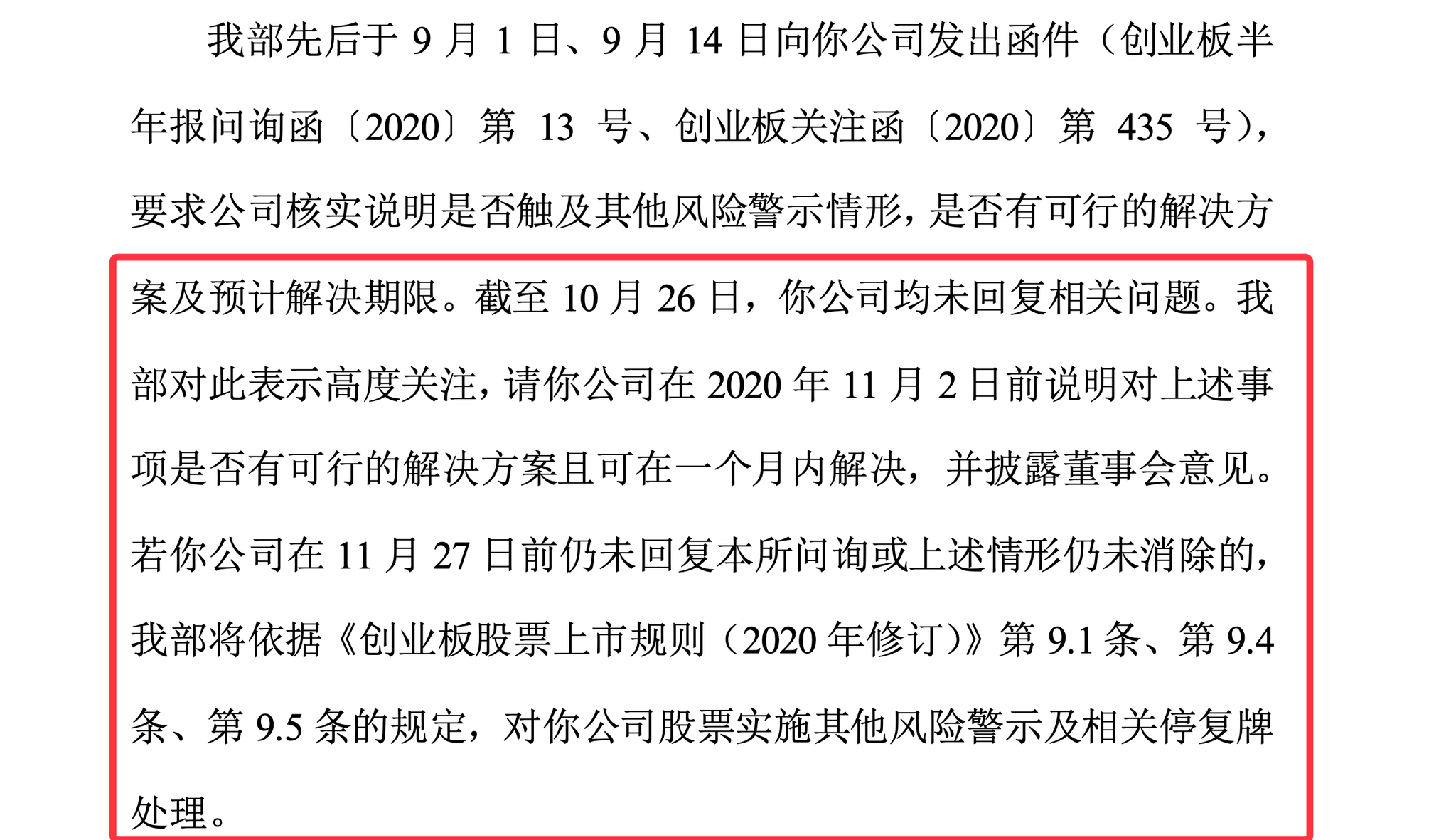 同时关注函中称,深交所先后于9月1日、9月14日向公司发出包括半年报问询函、关注函等在内的函件,要求公司核实说明是否触及其他风险警示情形,是否有可行的解决方案及预计解决期限。