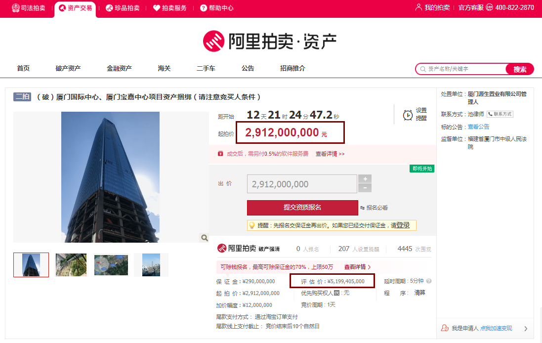 原标题:“厦门第一高楼”二次拍卖!起拍价29.12亿,打了近6折暂无人报名