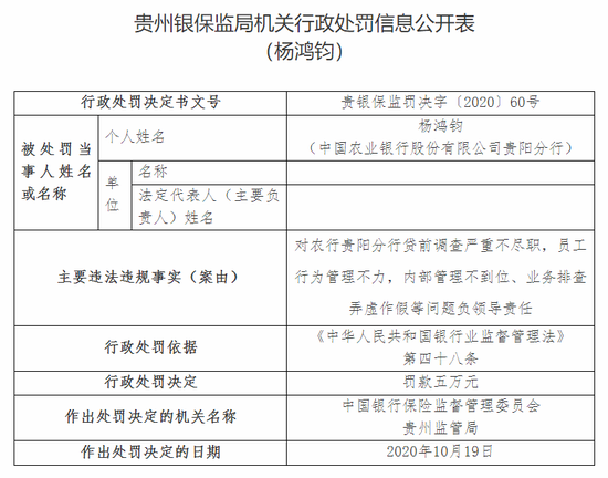 10月28日消息,贵州银保监局公布的行政处罚信息公开表显示,中国农业银行股份有限公司贵阳分行因贷前调查严重不尽职;员工行为管理不力;内部管理不到位,业务排查弄虚作假,被处罚款50万元。同时,分行负责人杨鸿钧对农行贵阳分行贷前调查严重不尽职,员工行为管理不力,内部管理不到位、业务排查弄虚作假等问题负领导责任,被处罚款5万元。