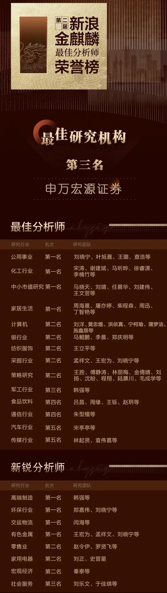 10月28日,第二届新浪金麒麟最佳分析师评选结果出炉,申万宏源证券荣获最佳研究机构第三名。