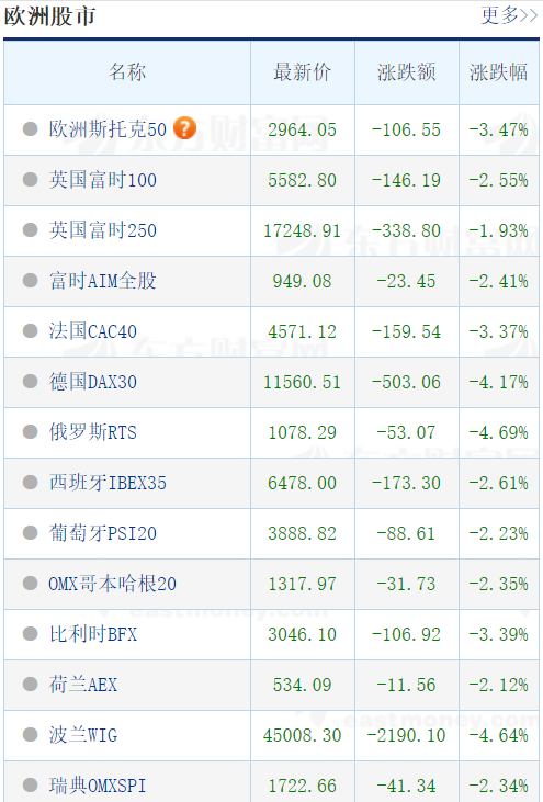 英国富时100指数收跌2.55%,泛欧斯托克600指数收跌2.95%,德国DAX指数收跌4.17%,法国CAC指数收跌3.37%,意大利富时MIB指数收跌4.06%。