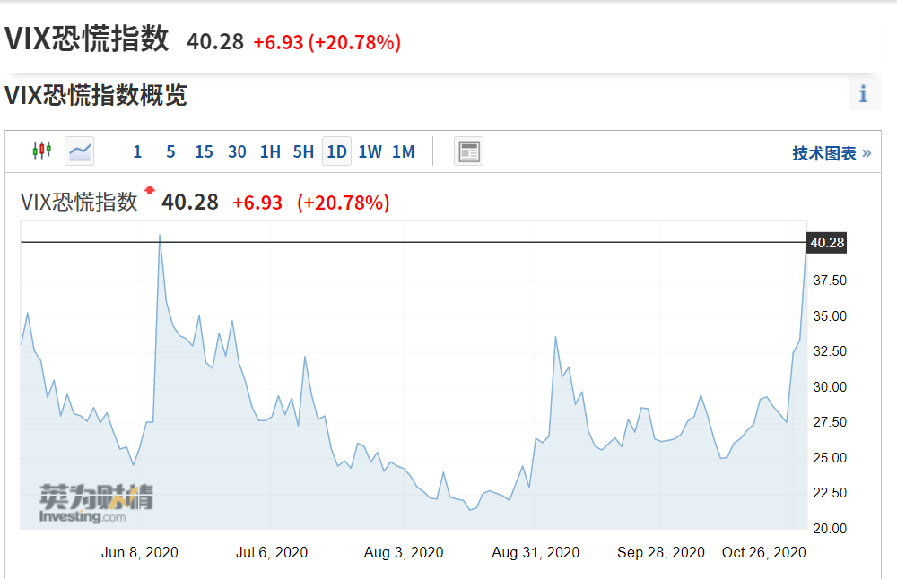 衡量美股市场恐慌情绪的VIX指数大涨20%,报40.28,创6月中旬以来新高,远超20的长期平均值。