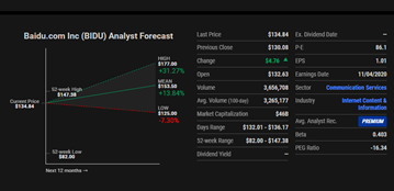 据外媒 Investors Observer报道,百度的评级表现优于市面67%的股票,华尔街分析师对百度评级为“强烈建议买入”,未来12个月平均目标价为153.5美元。