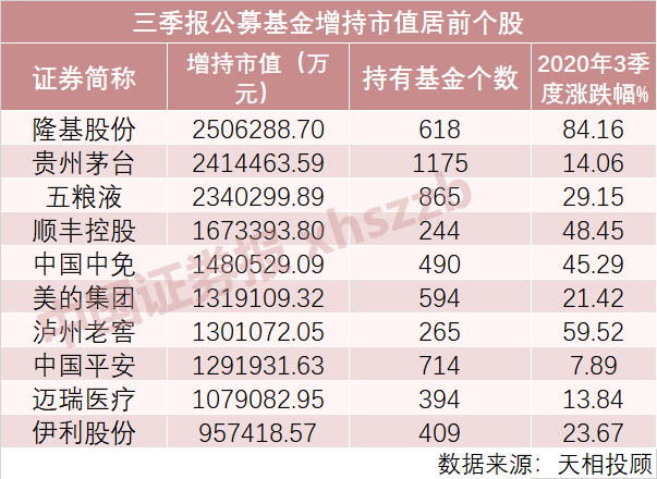 隆基股份是基金增持市值最多的个股,三季度增持金额达250.63亿元。持有该股的基金从二季度的280只猛增至618只。