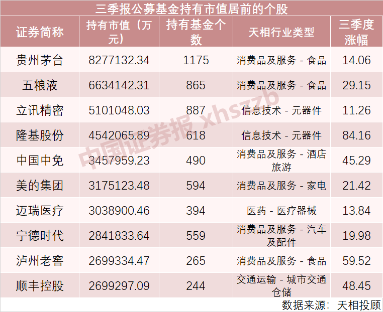 从股价表现上看,前十大重仓股三季度平均涨幅为34.71%。