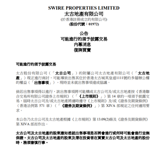 10月28日,太古系三支股票太古A(019)、太古B(087)、太古地产(1972) 上午9:57起停牌,之后于下午1时起复牌。