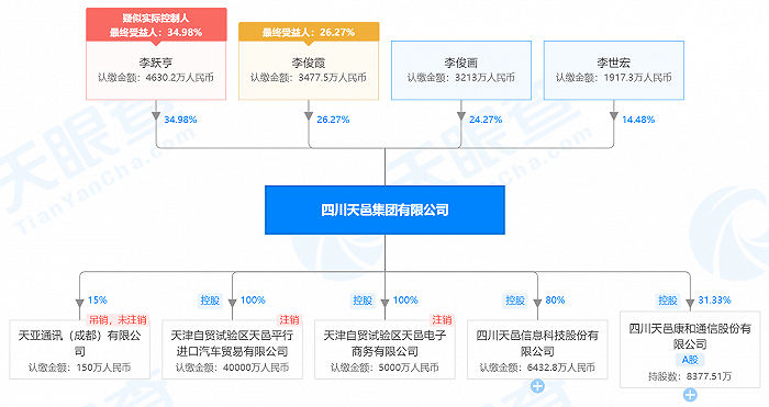 进一步看,李跃亨也正是天邑股份董事长李世宏的父亲。除了李世宏之外,“李氏家族”还有李俊霞、李俊画为上市公司董事、副董事长,同时也拥有上市公司股份。天眼查显示,李跃亨、李世宏、李俊霞、李俊画合计持股天邑集团100%的股份。2019年10月10日,李跃亨家族以42亿元位列《2019年胡润百富榜》第980位。