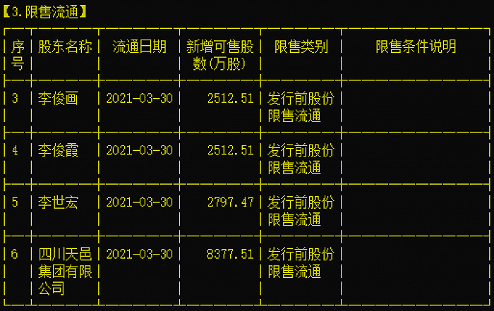公开信息显示,天邑股份下一次巨量解禁,将在2021年的3月30日,届时天邑集团将解禁8377.51万股,李世宏、李俊霞、李俊画将分别解禁2797.47万股、2512.51万股、2512.51万股。