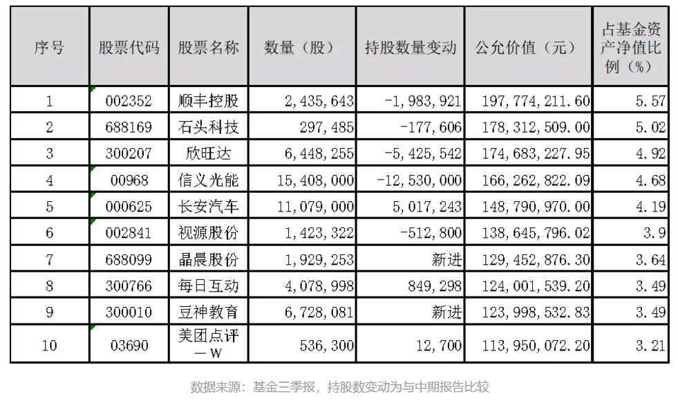 以景顺长城创新成长基金为例,十大重仓股出现了较大变化,顺丰控股、石头科技、欣旺达、信义光能和视源股份遭到部分减持,长安汽车、晶晨股份、每日互动、豆神教育新进入十大重仓股行列,而浙江鼎力、当升科技、横店东磁、星源材质、新宙邦则掉出前十大重仓股。