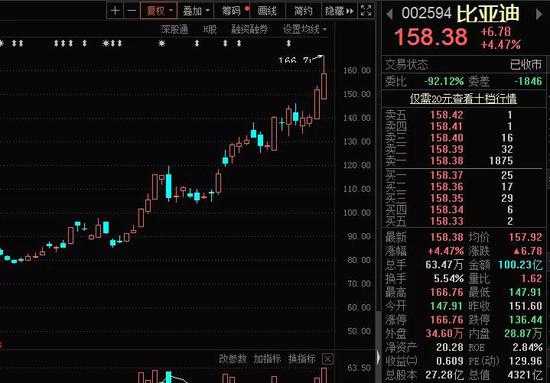 比亚迪三季度业绩也表现出色,前三季度实现归母净利润34至36亿元,同比增长115.97%至128.67%,相比一季报和半年报净利增幅扩大。今日,公司股价也创下了历史新高166.76元/股,今年以来上涨了232.48%。