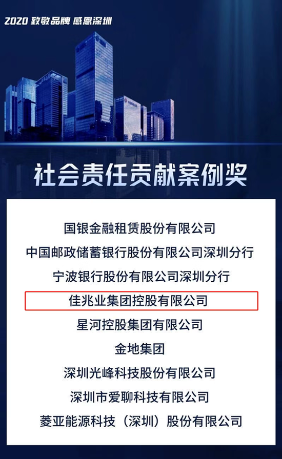 10月30日,由南方报业传媒集团、南方日报举办的“致敬品牌·感恩深圳”深圳特区建立40周年品牌发展暨2020深圳企业社会责任峰会在深圳举行。凭借在扶贫济困领域的突出贡献,以及深耕打造的惠州龙门精准扶贫样本,佳兆业集团荣获“社会责任贡献案例奖”。