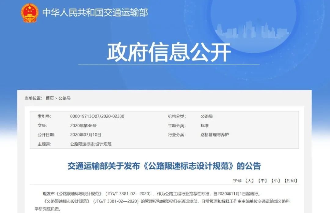 为合理控制公路车辆行驶速度,交通运输部发布了《公路限速标志设计规范》,自2020年11月1日起施行。《规范》明确了公路限速标志设计的原则、限速值的确定方法、限速标志及相关设施设置要求等主要技术内容。具体包括:高速公路限速值不得超过120km/h;限速值应为10km/h的整数倍;相邻两个限速路段的限速值之差不应大于20km/h;学校区域限速标志宜设置在距学校区域起点前100~150m处等。