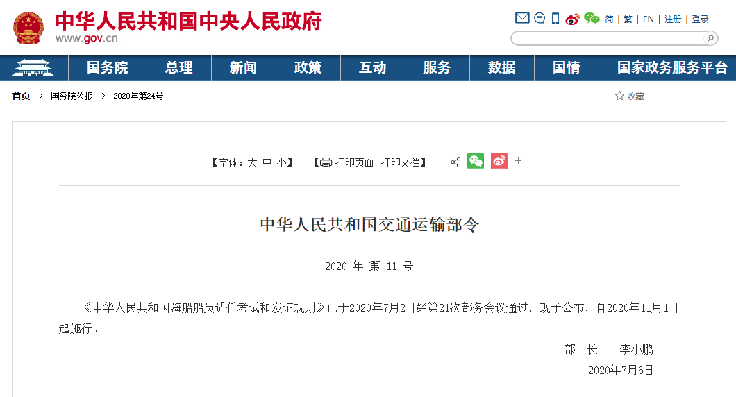 交通运输部颁布了新修订的《海船船员适任考试和发证规则》,自2020年11月1日起施行。《规则》明确,允许全日制航海类中职/中专毕业生直接参加无限航区三副、三管轮、电子电气员适任考试;将航海类学生在校期间参加值班水手、值班机工、电子技工适任考试的时间限制从“毕业或者结业前6个月”调整为“毕业或者结业前12个月”。在保证培训质量前提下,将三副、三管轮晋升二副、二管轮的服务资历以及非航海类大专以上学员参加适任培训时间由18个月缩短至12个月。