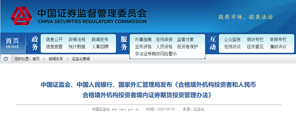 经国务院批准,中国证监会、中国人民银行、国家外汇管理局联合印发《合格境外机构投资者和人民币合格境外机构投资者境内证券期货投资管理办法》,中国证监会同步发布配套规则《关于实施〈合格境外机构投资者和人民币合格境外机构投资者境内证券期货投资管理办法〉有关问题的规定》,自2020年11月1日起施行。