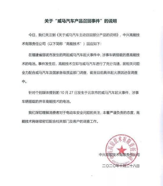 记者了解到,此次召回涉及到的供应商是中兴高能。公开资料显示,中兴高能是中兴通讯旗下100%控股的新能源板块规模控股子公司,主要致力于研发、生产、销售新能源汽车动力电池系列产品,其主要产品为方形铝壳三元电池,截至2020年9月底累计给威马汽车装车超过3000辆。