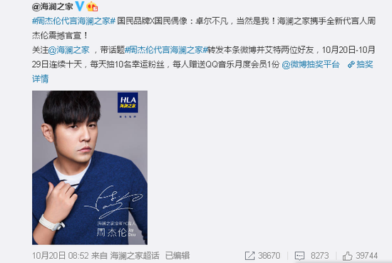 10月20,海澜之家在微博上直接官宣,周杰伦成为全新代言人,并附上代言照。