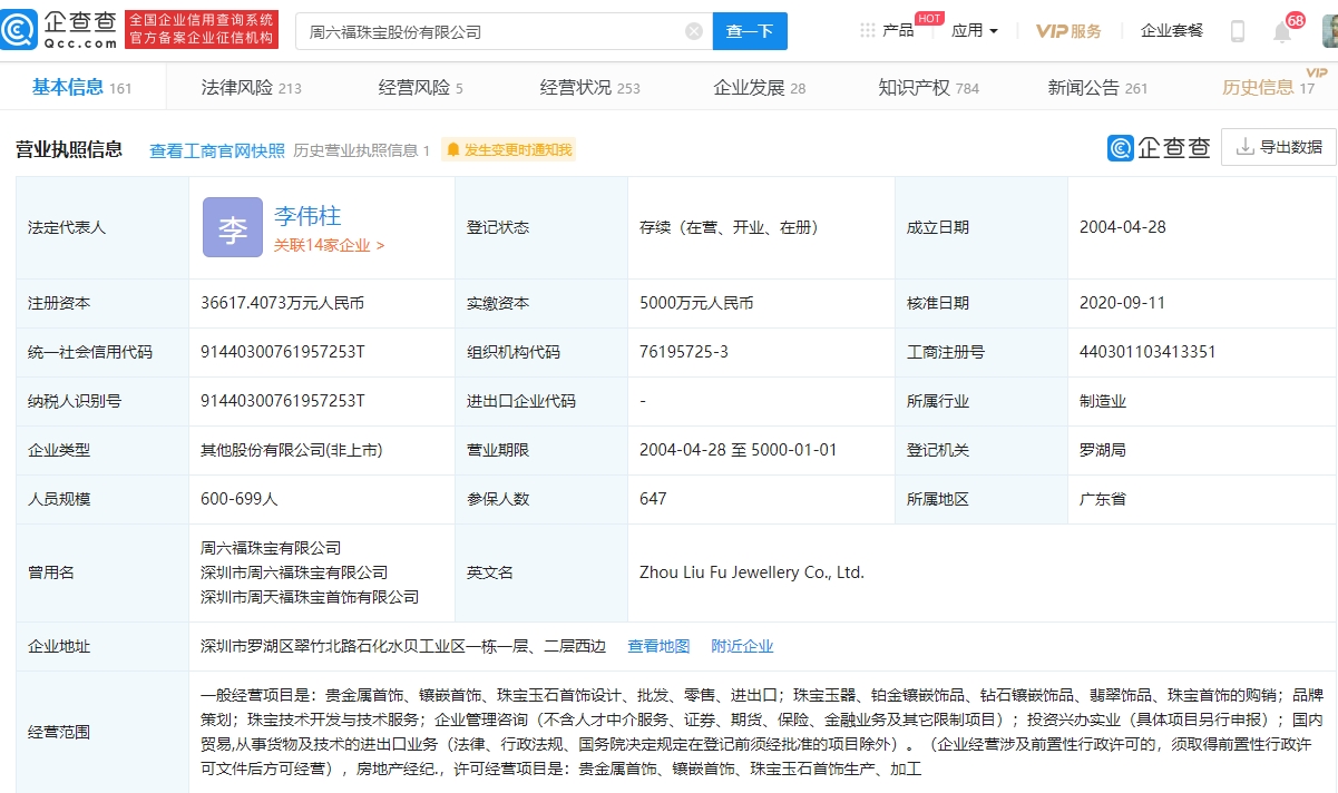 企查查APP显示,周六福是集珠宝营销、研发、设计、制造、零售于一体的知名珠宝品牌,成立于2004年,注册资本3.66亿元人民币,法定代表人为李伟柱。企查查显示,目前周六福共有12家分支机构,参股控股企业共有11家。