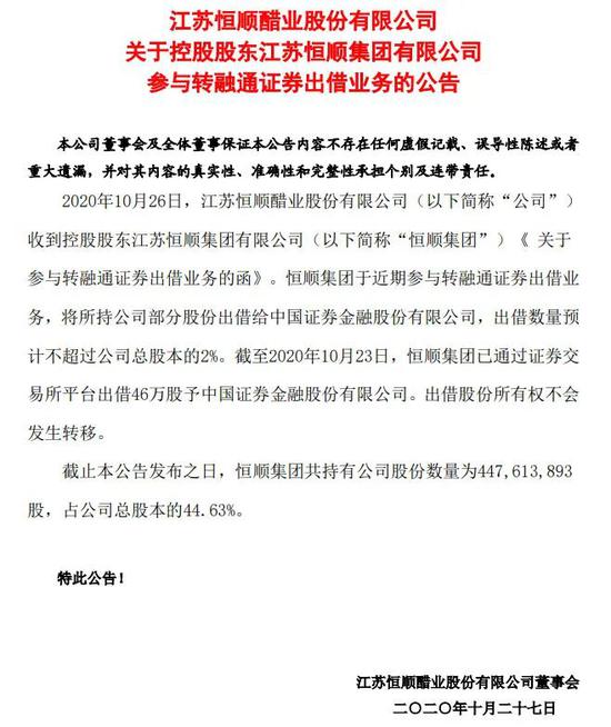 10月26日晚间,恒顺醋业披露《关于控股股东江苏恒顺集团有限公司参与转融通证券出借业务的公告》,公告内容显示:
