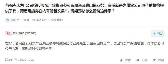 交易所互动平台中,已经有部分投资者对控股股东出借公司股份的情况表示担忧。宏大爆破日前收到投资者提问:公司控股股东广业集团参与转融通证券出借业务,是否是为做空公司股价的机构提供“子弹”,请问公司怎么看待这件事?