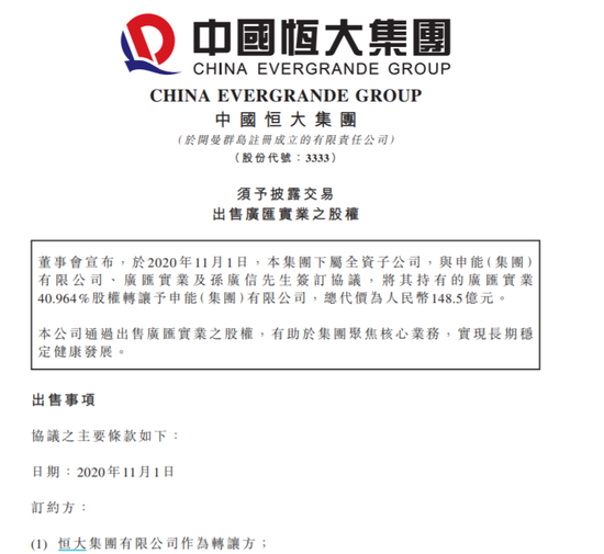 中国恒大11月1日晚间公告披露,当日公司下属全资子公司恒大集团和申能(集团)有限公司(以下简称“申能集团”)、新疆广汇实业投资(集团)有限责任公司(以下简称“广汇集团”)及孙广信签订协议,恒大集团拟将其所持广汇集团40.964%股权作价148.5亿元转让给申能集团。