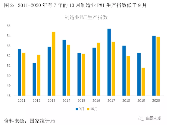 2011~2020这10年有7年的10月PMI生产指数和9月相比是下降的。过去9年制造业PMI生产指数9月和10月的均值分别为52.8%、52.6%,环比下降0.2%,和今年环比下降0.1%接近,因此生产下降能够用季节性规律来解释。