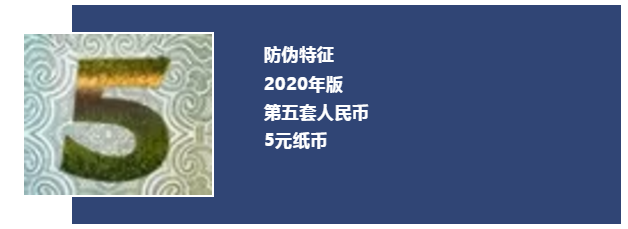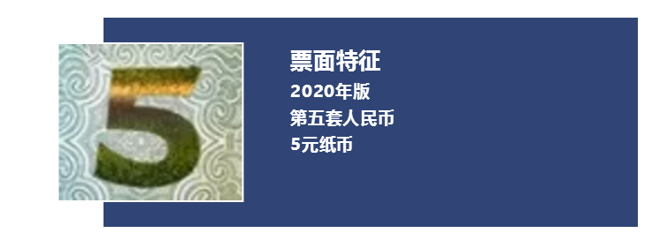 2020年版第五套人民币5元纸币保持2005年版第五套人民币5元纸币规格、主图案、主色调、“中国人民银行”行名、国徽、盲文面额标记、汉语拼音行名、民族文字等要素不变,优化了票面结构层次与效果,提升了整体防伪性能。