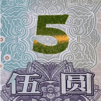 位于票面正面中部。改变钞票观察角度,面额数字“5”的颜色在金色和绿色之间变化,并可见一条亮光带上下滚动。