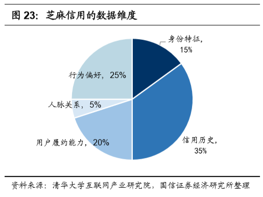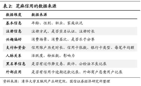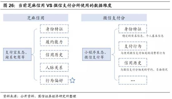 征信是一项具有先发优势的业务,在这方面蚂蚁显著领先。随着微信生态的繁荣,腾讯有望缩短和蚂蚁之间的差距,但征信行业已经进入了规范发展期,腾讯可能需要较长的积累时间。我们逐一分析蚂蚁征信系统所使用的数据维度: