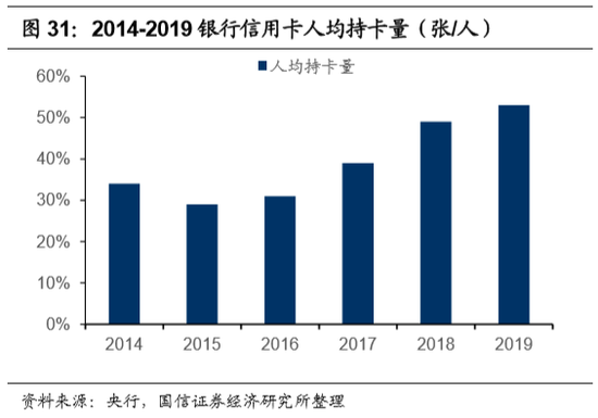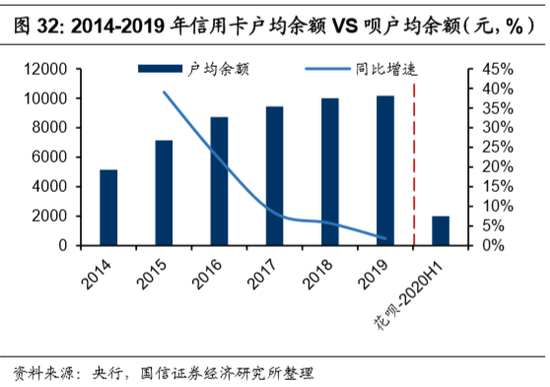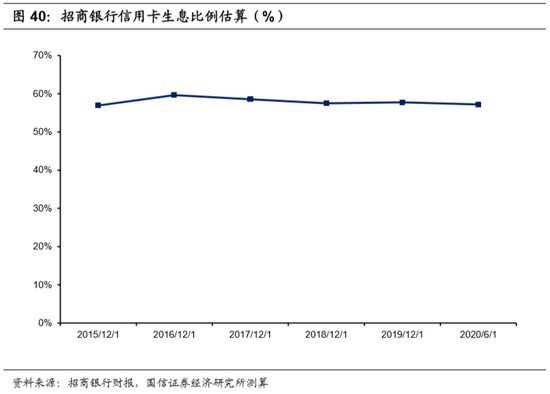 1) 生息率:随着账单厚度的增加,花呗的生息比例有望继续提升。生息率的增长,主要依托于花呗账单厚度的增加,以及花呗分期渗透率的提升。2019年,我国社零总额为41万亿元,其中,线上零售约8.5万亿元,线下零售额约32.3万亿元,接近线上的4倍,线下采购汽车、家具等大额支付的场景,是花呗分期尚未充分渗透的空间。我们估算,2019年以来,招商银行信用卡的生息比例稳定在50%以上。随着花呗账单厚度的增加,其生息的比例存在提升的可能性。