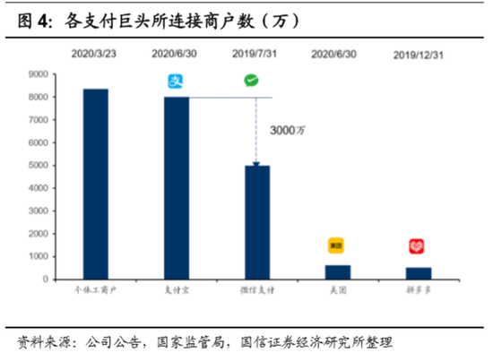 商户侧,蚂蚁更具优势,主要系淘系电商的资源独享。国家监管总局数据显示,截至2020Q1,我国注册在案的个体工商户有8353万个。蚂蚁招股书中披露,截至2020H1,支付宝月度活跃商户数超过8000万;微信支付方面,截至2019年7月,其连接个体商户与商家数量为5000万个。我们推测产生差异的原因如下:1)淘系电商、闲鱼等平台,有千万量级的商户为蚂蚁独占商户;2)双方对于活跃商户数的统计口径可能存在一定差别。