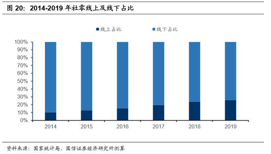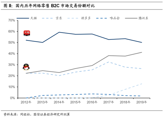 线上场景中,微信的独占场景不及支付宝。2012-2019年,天猫在线上B2C领域的市场份额始终保持在50%以上,而战事最为激烈的2014年,腾讯系企业拼多多及美团尚未发迹,京东在线上零售的份额仅有20%出头。随着拼多多迅速崛起,小程序电商GMV迅速增长,微信支付在线上电商的份额有所提升,但淘系电商的市场份额依然稳居第一。
