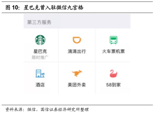 O2O和线下场景是微信破局的关键,腾讯的投资及微信生态在线下场景的拓展中发挥了关键性作用。2014年,滴滴和快的在线下发起了补贴大战,标志着线下场景争夺战正式开始;在纯线下场景中,为了抢占线下小微商户,微信生态的力量发挥了重要作用:微信开放公众号、朋友圈广告、小程序、卡包给小微商户,帮助头部商户与消费者建立更紧密的联系,这让很多行业的头部企业趋之若鹜。在格局分散的线下餐饮行业中,微信支付以九宫格流量入口和社交礼品券为筹码,与餐饮巨头星巴克签下了一定期限内的排他协议,并形成了非常强的示范效应。