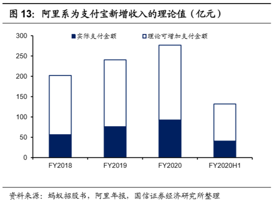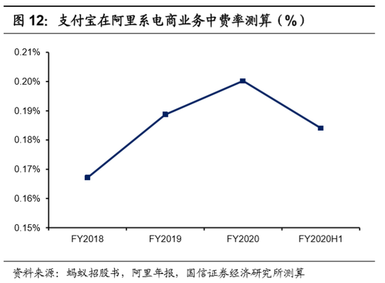 在盈利能力最强的线上场景中,支付宝为淘系电商充当了基础设施,费率常年稳定在0.2%以下。线上是移动支付盈利的最佳场景。然而,通过蚂蚁与阿里的支付交易金额及GMV可以推算,FY2018-FY2020H1,支付宝在淘系电商中的商业支付费率稳定在0.2%及以下,承担了淘系电商基础设施的角色。理论上,线上支付场景的费率可以达到0.6%。若支付宝与阿里集团之间的交易费率达到0.6%,FY2020可以为蚂蚁集团带来184亿的新增收入。