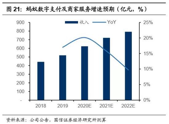 支付业务对蚂蚁、对整个阿里系的战略意义都非常重大,将作为基础设施为其他业务引流:FY2020,饿了么超过40%的新增消费者都来自于支付宝;支付环节,能够沉淀资金和数据,并衍生出信贷业务,继而为现金贷业务筛选客户,培育用户对于金融工具的心智。支付对蚂蚁的战略意义远超盈利意义,我们预计未来3年,数字支付与商家服务收入复合增速为15%。