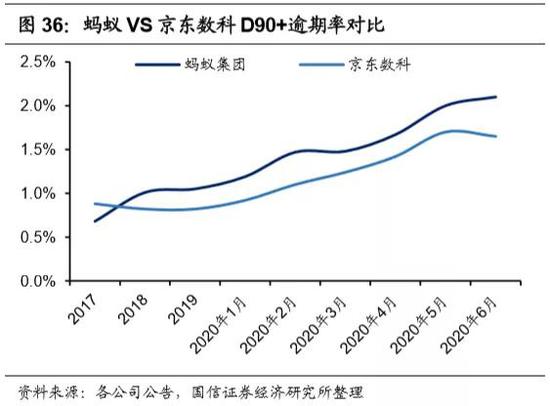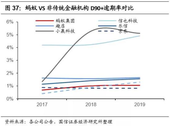 与同类的消费金融机构相比,蚂蚁在助贷规模超过同行的前提下,D90+逾期率表现也非常出色,仅次于京东及360。我们认为原因为:京东及360同为互联网企业,能接触到海量用户,拥有用户数据及技术优势;且2019年,京东和360的贷款规模仅相当于蚂蚁的23%及4%,且信贷规模增速比蚂蚁更快,其逾期率表现自然相对优异。2017年,蚂蚁的消费信贷规模为6475亿元,D90+逾期率为0.68%;2019年,京东数科的信贷规模为4589亿元,D90+逾期率为0.82%