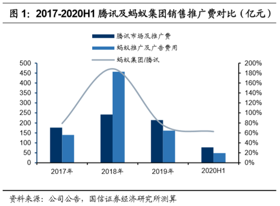 1) 销售费用&交易笔数:蚂蚁推广更激进,但腾讯交易笔数更强