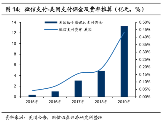 反观微信支付的线上业务,其支付的费率一直在恢复进程中。我们从美团、京东的公告数据中推测,在“腾讯系”互联网企业的发展初期,微信支付的费率非常低,支付和流量一样,是腾讯资源支持的一部分。而随着这类企业的发展壮大,线上支付的费率在持续恢复。通过公开数据可推算,2019年,微信支付在美团、京东上的支付费率均有明显的提升,但距离0.6%的理论值仍有较大的提升空间。2019年这部分业务费率的恢复,是微信支付收入大幅增长的重要原因。