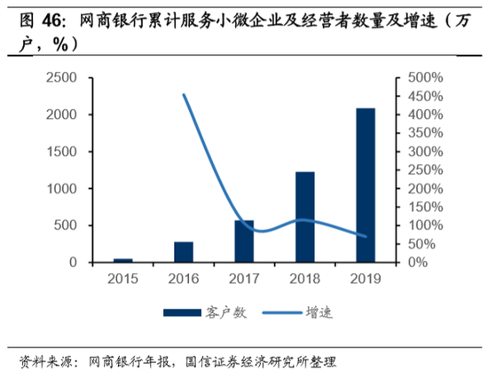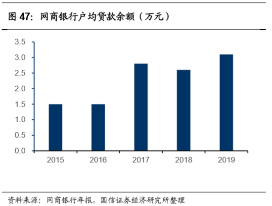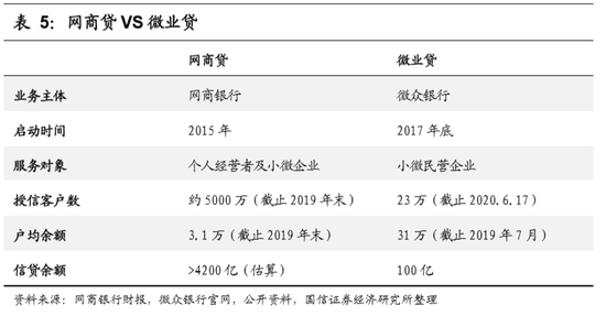 相比之下,腾讯于2017年底才通过微众银行推出面向民营企业的“微业贷”。截止2019年末,微业贷触达小微民营企业仅为90万家,我们测算,服务数量不及网商贷的1/10。同时,2019年末,网商贷的户均信贷余额为3.1万元,远低于微业贷的31万元,也证实了二者业务面向客群的差异。我们判断,产生明显差异的原因如下:与消费贷相比,小微经营贷款的授信风险更大,大规模开放小额个人经营信贷需要很强的风控能力。因此征信能力较弱的微业贷选择先小范围试水,积累经验,也体现了其对于金融业务的审慎态度。