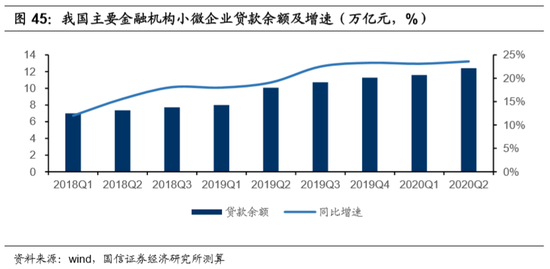 从行业增速的实际表现来看,近年来,我国小微企业信贷的增速持续走高。2020Q2,我国主要金融机构小微企业贷款余额为12.41万亿,同比增长23.6%,同比增速实现8个季度的连续增长,并且显著高于金融机构的各项贷款增速,供给、需求端均表现出了旺盛的生命力。