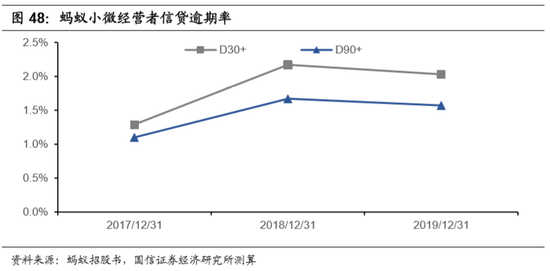 横向来看,蚂蚁在促成信贷规模显著高于同行的情况下,蚂蚁的消费信贷D90+逾期率表现优于传统的银行机构。我们与业内风控水平较高的招商银行、工商银行和光大银行进行对比,2017-2019年,蚂蚁的个人消费信贷D90+逾期率显著低于以上几大银行,传统银行机构放贷审核标准严苛,而蚂蚁主要依赖多维度用户数据,以上数据体现了蚂蚁在风控方面的实力。而自2018年以后,蚂蚁小微信贷的D90+逾期率,较三大银行有所提升,我们推测,主要系服务小微企业数量增幅较快,及企业经营贷款坏账率高于个人信贷。