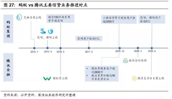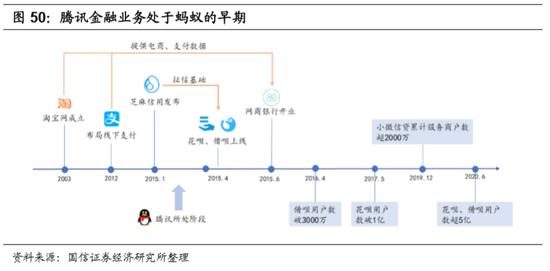 蚂蚁“小额授信、迭代增长”的策略,或许能为腾讯金融科技业务的发展提供启示:芝麻信用体系是借贷业务的基石,腾讯已经于2020年6月推出了微信支付分;信用体系建立后,蚂蚁推出了花呗业务,采取“小额授信,迭代增长”的策略,并积极拓展线下场景,增加用户使用频次。通过消费贷业务筛选出优质客群,导流至借呗业务进行变现。依托于在线上淘系电商的数据,以及线下积极拓展码商,蚂蚁的小微企业贷款成长效率非常高。相应的,腾讯已经于2020年3月内测分付,我们通过前文分析可得,蚂蚁征信模型中的数据,对腾讯而言,需要通过场景的积累慢慢补齐,但并非不可得。目前来看,腾讯发展消费贷和小微贷的优势在线下,金融业务要随着生态的丰富而慢慢成长。