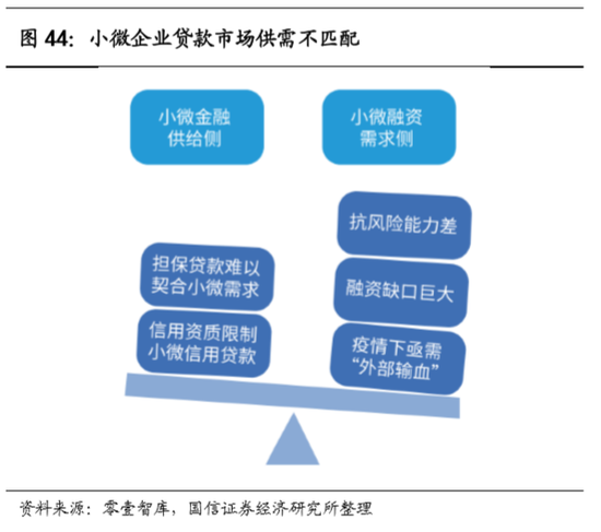 需求端:小微企业融资的需求长期难以满足,需求侧和资金供给侧存在着巨大的鸿沟。小微企业贡献了我国80%以上的城镇就业和90%以上的市场主体份额。然而,由于缺乏充足的数据和信用积累,目前在商业银行有贷款的、有贷款余额的小微企业和工商个体户的总数约为2200万,渗透率仅为20%。我国小微企业的潜在融资需求达4.4万亿美元,潜在融资缺口为1.9万亿美元,缺口比重高达43%。
