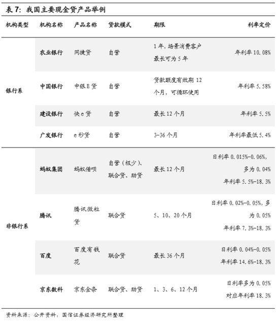 竞争壁垒不同:借呗内嵌在消费场景中,这会隔绝很多缺少场景和流量入口的中小玩家。而现金贷类产品不需要消费场景,这导致借呗的竞争对手更加广泛。目前现金贷产品的设计和管理都比较相似,主要差异出现在额度和综合利率上。大型商业银行资金成本低、客户优质,年化利率一般较低,但难以覆盖无资产、无信用记录的客户群体;而互联网企业能覆盖到更加长尾的客群,以腾讯的现金贷产品“微粒贷”为例:截至2019年末,“微粒贷”的授信客户中,约77%从事非白领服务业,约80%以下为大专及以下学历,笔均贷款约8000元