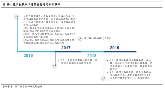 花呗对线下场景的拓展非常重视,在成立1年后,就非常积极的拓展线下场景:2016年5月,花呗联手复旦大学华山附属医院推出医疗分期服务,与超过150家医院达成了协议;6月初,花呗进入生活缴费领域,在浙江、上海等7个城市推出电费代扣功能;6月22日,花呗与西单大悦城达成战略合作,在大悦城内接入超过200个商家。花呗在2016年使用了代理商模式,为了完成冷启动,调动代理商的积极性,允许代理商通过利率差来获利,这直接推动了花呗在线下场景的第一次爆发。