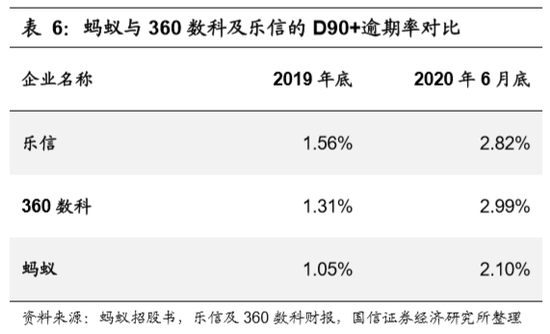 纵向来看,随着规模的扩张,蚂蚁D90+逾期率的表现相对稳定,疫情的考验,更证实了其超过其他机构的风控能力。2017-2019年,蚂蚁促成的信贷余额从6475亿增长到2.01万亿,规模增长超过3倍,而消费信贷的D30+逾期率从最初的1.08%提升到了1.56%,D90+逾期率从0.68%提升到了1.05%,仍低于同等规模量级下,传统金融机构的逾期率。同时,本次疫情对于蚂蚁的风控能力也是一次重大测试:疫情期间,蚂蚁的逾期率上升幅度,显著低于同类型的企业360数科及乐信,这也在印证其较强的风控能力。2020H1疫情之下,蚂蚁D30+、D90+的逾期率均增长至2%以上,随着疫情的放缓,增速均有所放缓。