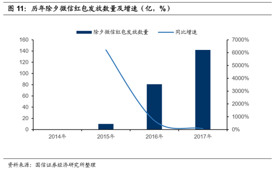 用户端,微信支付在用户绑卡这一关键环节的壁垒,被“春节红包”彻底的击碎。2014年春节,腾讯推出微信红包,从除夕到初一吸引了超500万用户参与,收发红包数量达1600万个。用户收到红包后,自然产生提现诉求,绑卡行为随之发生。腾讯在2014年年报中披露,其微信支付和QQ钱包的绑卡量突破1亿,微信支付凭借社交生态,用不到1年的时间完成了蚂蚁近4年的成绩。此后,微信支付乘胜追击:2015年冠名春晚,并联合外部企业推出“摇一摇”抢红包的形式,当晚收发红包总量超过10亿个。在随之而来的2016、2017年,除夕微信红包的收发数量逐年攀升,微信支付的市场份额持续走高。在民众的狂欢中,腾讯通往支付的绑卡壁垒,被“红包”彻底击碎。